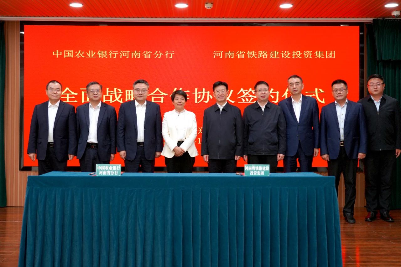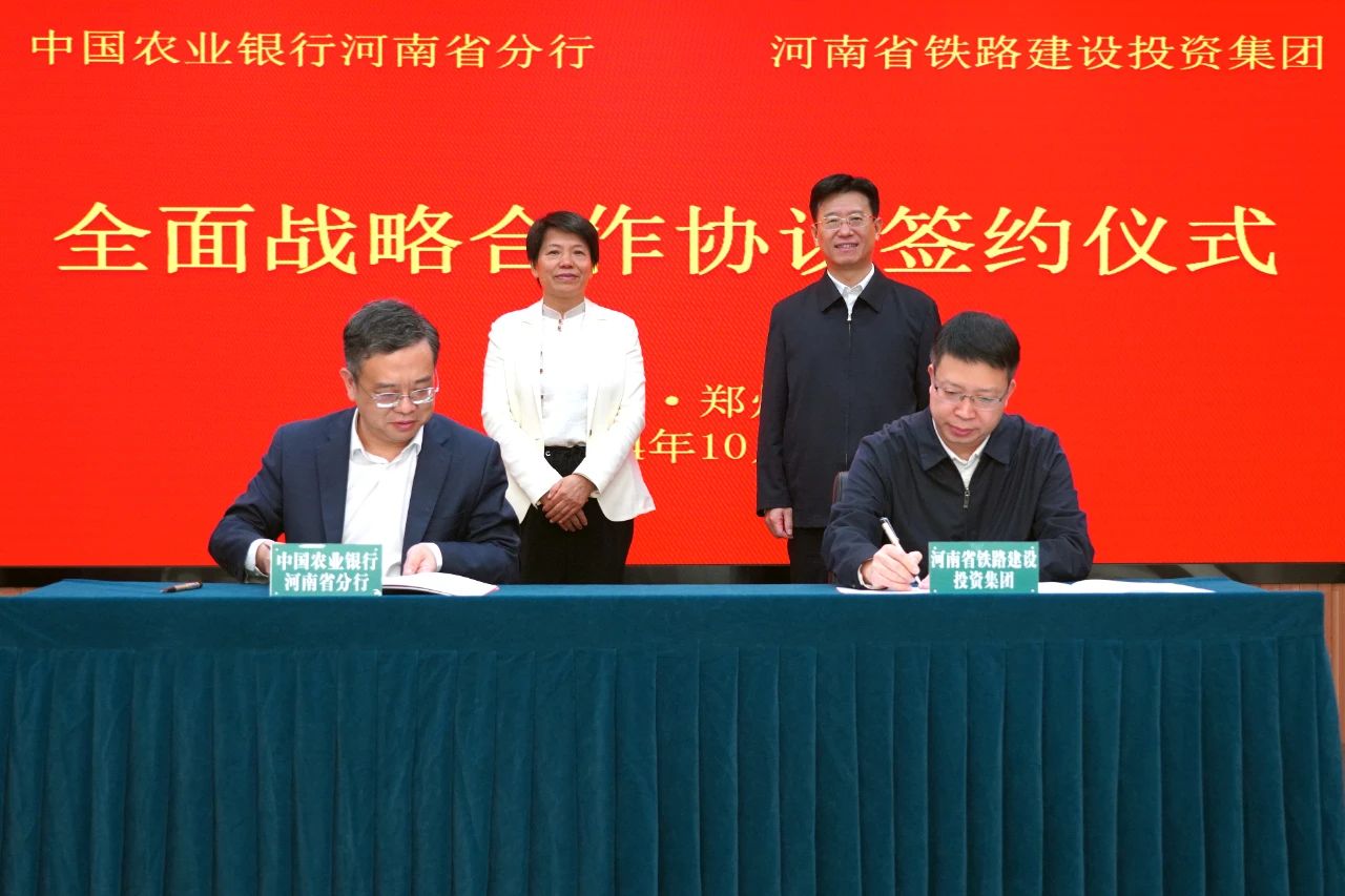 10月23日,河南铁建投集团与中国农业银行河南省分行签署全面战略合作协议。河南铁建投集团党委书记、董事长悦国勇,中国农业银行河南省分行党委书记、行长韩静出席活动。